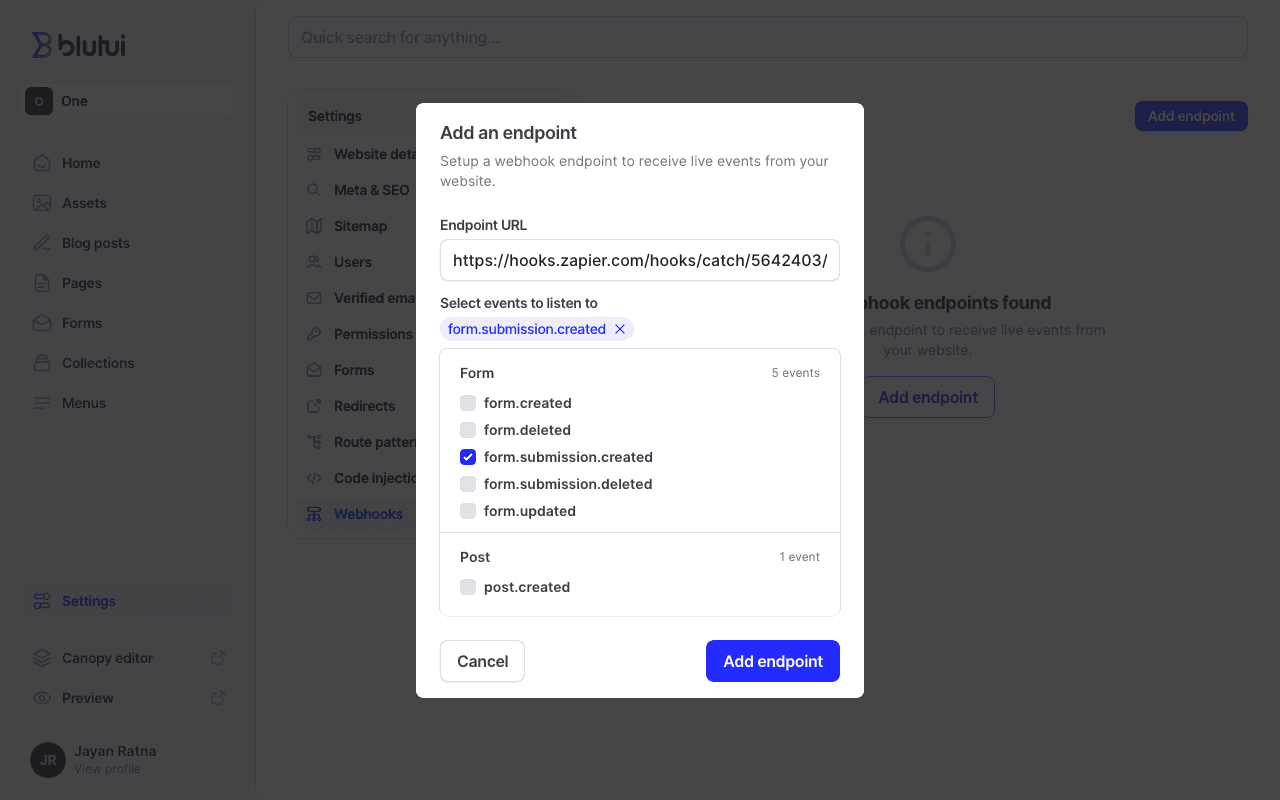 In this guide we'll learn how to subscribe to the form.submission.created event and send a webhook request to Zapier. You can use Zapier to automate your Blutui project workflows by sending form submission to a Google Sheet, Slack, Mailchimp, and much more.